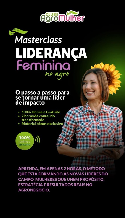 Durante 2 horas, você vai aprender o passo a passo para construir sua liderança no agro, com base no mesmo método aplicado no Programa Líder de Impacto, que já transformou centenas de mulheres pelo Brasil.